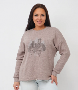 Обьемная ткань обеспечивает приятную мягкость и дополнительную защиту от холода, что особенно важно в межсезонье или прохладные дни. Круглый вырез горловины оформлен аккуратно, без лишних деталей — такой вариант универсален и удобен для ежедневной носки или отдыха дома. Оригинальная отделка стразами добавляет необычный акцент: изделие приобретает праздничное настроение, но при этом остается сдержанным и уместным даже для офиса.