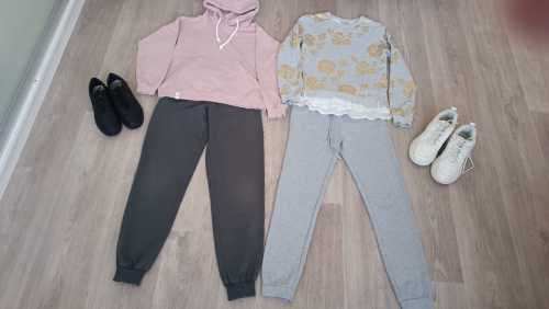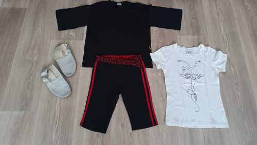5. На 130-145 см. Цена за все. Футболка Arina Ballerina белая , велосипедки, черная футболка VM, серые чешки. Цена 550 за все